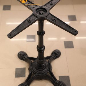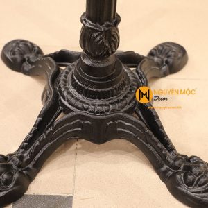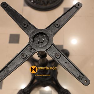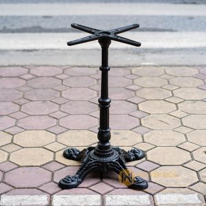 Chân bàn gang đúc chữ thập được sơn tĩnh điện màu đen với họa tiết chân trụ giả cổ theo phong cách tân cổ điển được dùng làm bàn cafe, nhà hàng, khách sạn, bàn ghế quán ăn nhanh fastfood, quán trà sữa, trà chanh, cửa hàng, showroom, quầy bar nhỏ gia đình, phòng tiếp khách, chân gang đúc có thể để ngoài trời mà không phải lo lắng về điều kiện thời tiết. Chân được đúc bằng gang nguyên khối làm tăng độ vững chắc cho chiếc bàn, phần bên trên là mặt bích hình vuông có sẵn lỗ để khoan bắt vít vào mặt bàn.