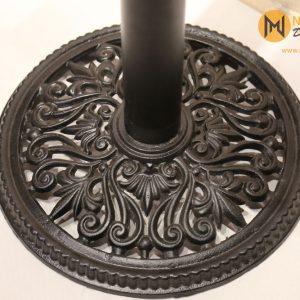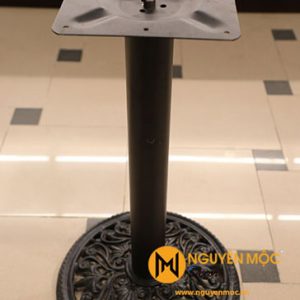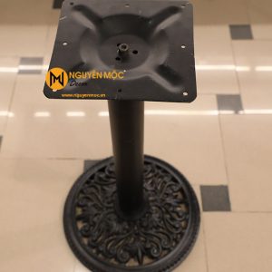 Chân được tách ra làm 3 phần để di chuyển thuận lợi: phần đế gang tròn bên dưới với những hoa văn rất tinh tế và chắc chắn, phần ống trụ tròn chất liệu bằng thép, phần mặt bích hình vuông có thể kết hợp với mặt bàn đá, mặt bàn gỗ hoặc mặt bàn sắt với kích thước đường kính từ 60cm – 80cm tạo thành sản phẩm ưng ý.