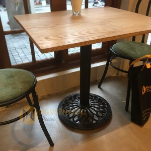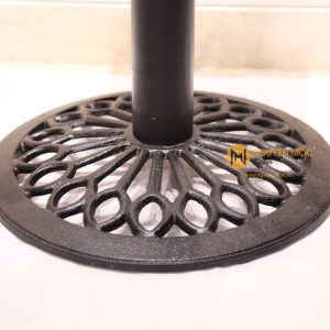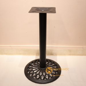 Chân được tách ra làm 3 phần để di chuyển thuận lợi: phần đế gang tròn bên dưới với những họa tiết hoa văn dơn giản nhưng lại rất tinh tế và chắc chắn, phần ống trụ tròn chất liệu bằng thép, phần mặt bích hình vuông có thể kết hợp với mặt bàn đá, mặt bàn gỗ hoặc mặt bàn sắt với kích thước đường kính từ 60cm – 80cm tạo thành sản phẩm độc đáo.